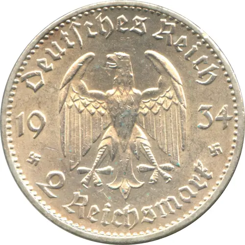 | Obverse lettering | Deutsches Reich 19 34 2 Reichsmark (Translation: German Reich 19 34 2 Reichsmark) |