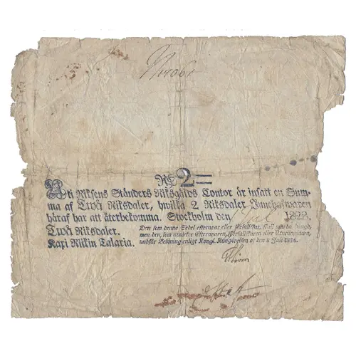 Rd. 2- Uti Riksens Ständers Riksgälds Contor är insatt en Sum- ma af Twå Riksdaler, hwilka 2 Riksdaler Innehafwaren häraf har att återbekomma. Stockholm, den 1 juli 1828. Twå Riksdaler Kaxi Riikin Talaria Den som denne Sedel efterapar eller förfallskar, skall warda hängd, men den, som uptäcker Efteraparen, Förfallskaren eller Utvrånglaren, undfår Belöning enligt Kongl. Kundgörelsen af den 8 Juli 1818. (Translation: 2 riksdaler of the realm. In the Realm`s Debt Office has been deposited a sum of two riksdaler, which two riksdaler the bearer is to receive. Stockholm, 1 July 1828. Two riksdaler of the realm Whoever imitates or counterfeits this banknote, shall be hanged, but he, who discovers the imitator or counterfeiter or disseminator, will be rewarded in accordance with the royal decree of 8 July 1818.) |