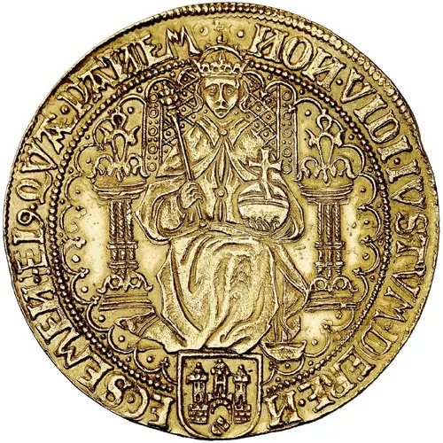 | Obverse description | Crowned sovereign seated in a gothic stall, holding orb in left hand and scepter in right hand, Kampen city shield at his feet. |