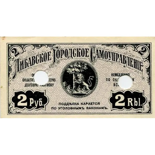 | Obverse lettering | Либавское Городское Самоуправление ОБЯЗУЕТСЯ ОПЛАТИТЬ НАСТОЯЩУЮ ДОЛГОВУЮ РАСПИСКУ НЕМЕДЛЕННО ПОСЛЕ ОКОНЧАНIИ ВОЙНЫ 2 Руб. ПОДДЪЛКА КАРАЕТСЯ ПО УГОЛОВНЫМЪ ЗАКОНАМЪ. 2 Rbl. (Translation: Libava City Government. [The government is] obliged to pay the debt banknote immediately after the end of the war. 2. Rub Forgery is punished under criminal law.) |