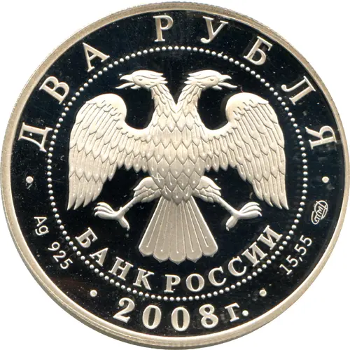 | Legenda do anverso | ДВА РУБЛЯ БАНК РОССИИ • Ag 925 • 2008 г. • 15,55 СПМД (Translation: Two Roubles Bank of Russia SPMD) |
