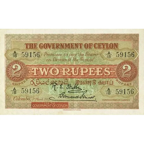 Obverse lettering THE GOVERNMENT OF CEYLON Promises to pay the Bearer on Demand the Sum of TWO RUPEES Colombo, 1st. March 1917. FOR THE GOVERNMENT OF CEYLON