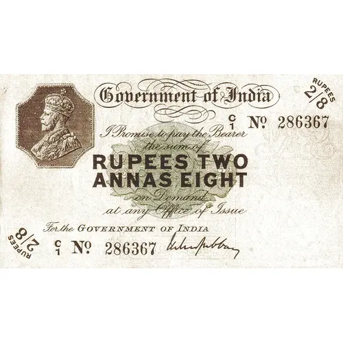 Following features on Obverse, - Engraved portrait representation of King George V on top left in an octagonal panel - Rupees 2/8 printed on top right and bottom left corners - Signed by M.M.S. Gubbay (Tenure: July 02, 1916- May 04, 1920) - Printed the bearer promise along with the amount in words over a bluish-green rosette in the centre - Note serial numbers on top right and bottom left near the value |