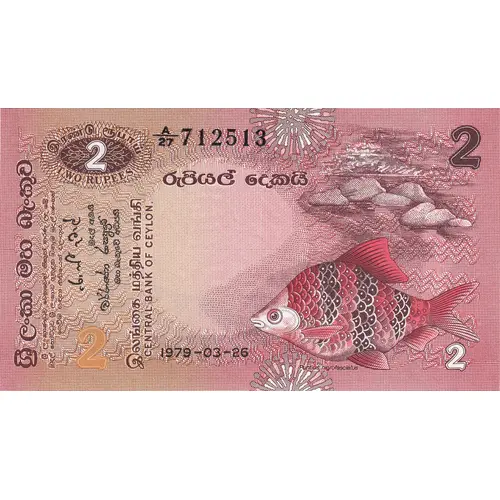 இரண்டு ரூபாய் TWO RUPEES රුපියල් දෙකක්ශ් ශ්රී ලංකා මහ බැංකුව ශ්රී ලංකාණ්ඩුව වෙනුවෙන් නිකුත් කරන ලද මේ මුදල් නෝට්ටුව ශ්රී ලංකාව ඇතුළත ඕනෑම මුදල් ගණනක් ගෙවිම සඳහා නිතියෙන් වලංගුය මුදල් ඈමති මහ බැංකුවේ අධිපති இலங்கை மத்திய வங்கி CENTRAL BANK OF CEYLON. 1979 – 03 – 26 Puntius nigrofasciatus (Translation: Two Rupees Two Rupees Central Bank of Sri Lanka Issued on behalf of the Government of Sri Lanka. This currency note is legally valid for payment of any amount within Sri Lanka. {signature of Ronnie de Mel} Finance Minister {signature of Warnasena Rasaputram} Governor of the Central Bank Central Bank of Sri Lanka Central Bank of Ceylon.) |