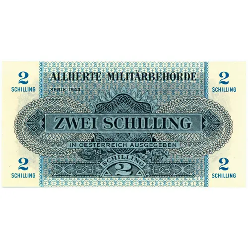 | Legenda do anverso | 2 SCHILLING ALLIERTE MILITÄRBEHÖRDE ZWEI SCHILLING IN OESTERREICH AUSGEGEBEN |