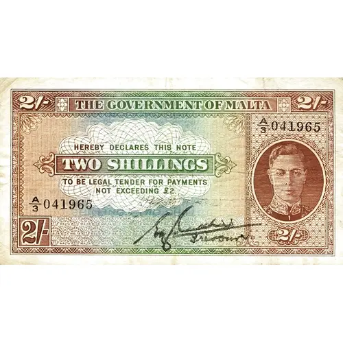 | Obverse lettering | THE GOVERNMENT OF MALTA HEREBY DECLARES THIS NOTE TWO SHILLINGS TO BE LEGAL TENDER FOR PAYMENTS NOT EXCEEDING £2 |
