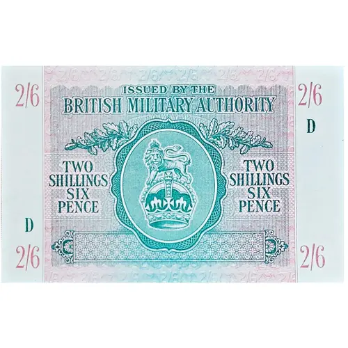 | Obverse lettering | ISSUED BY THE BRITISH MILITARY AUTHORITY TWO SHILLINGS SIX PENCE 2/6 |