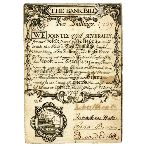 | Obverse lettering | THE BANK BILL Two Shillings. WE JOINTLY and SEVERALLY, for our Selves and Partners, promiſ to take this Bill as Two Shillings, lawful Silver Money, at Six Shillings, and Eight Pence Pʳ Ounce, in all Payments Trade and Buſineſs, & for Stock in our Treaſury at anyTime, & to pay the same at the Eſtimate on Demand, to Mʳ James Eveſeth or Order, in the Province or Manufactures enumerated in our Scheme; as recorded in the County of Eſsex`s Records, for Value rec.ᵈ Dated at Ipſwich, the Firſt Day of May, 1741 2ˢ 2ˢ JUSTITIA REDIVIVA |