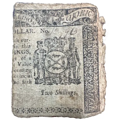 | Obverse lettering | ONE QUARTER OF A DOLLAR THIS BILL shall pafs cur- rent in all Payments in this Colony, for TWO SHILLINGS, (being equal to One Quarter of a Spanish Milled Dollar) or the Value thereof in Gold or Silver; according to the REsolution of the Provincial Congress of New-York, on the fifth Day of March, 1776 |