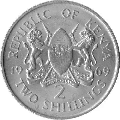 | Legenda do anverso | REPUBLIC OF KENYA 1969 HARAMBEE 2 TWO SHILLINGS (Translation: All pull together.) |