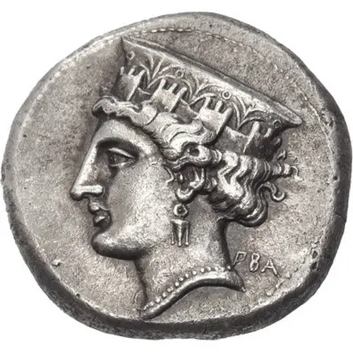| Obverse description | Head of Aphrodite to left, wearing an elaborate tiara composed of a mural crown with four towers enclosing a polos ornamented with palmettes and annulets, a disc earring with a triple pendant and a pearl. Behind her neck the lettering Π-ΒΑ |