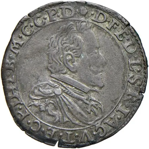 Draped and cuirassed bust on the right of Prince Federico Landi, adorned with the Golden Fleece collar. |