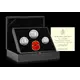 A quote from the Act of Remembrance known as ‘The Kohima Epitaph`, floral wreath around, triskelion above, poppy and silver fineness below |