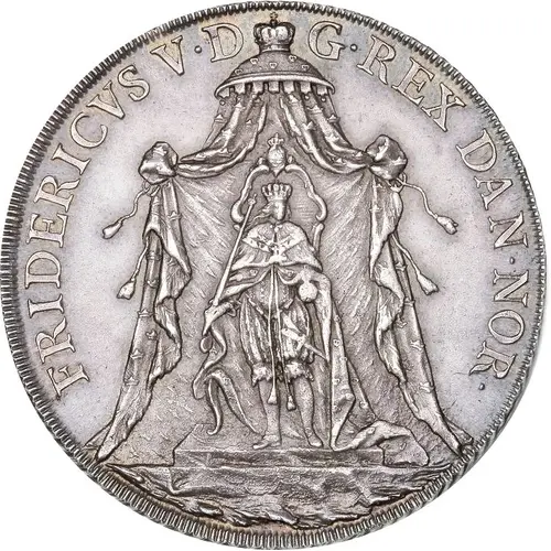 | Obverse description | Crowned King Frederik V in coronation clothes and long robe standing front under mantled canopy. King holds the Royal scepter and the Globus Cruciger, symbols of King`s power. |