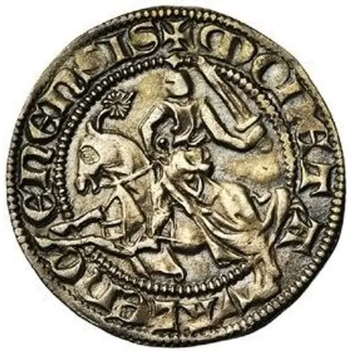 | Beschrijving voorzijde | Knight on horseback riding LEFT, sword held upright. Large feathered ornament on horse`s head, and horse`s legs dividing legend |