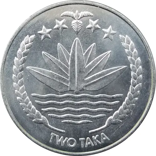 | Obverse description | Face value in an octagon with the National Emblem of Bangladesh: a water lily bordered on two sides by rice sheaves. Above are a three-leaf clover of tea leaves and four stars representing the four principles of the first constitution of Bangladesh in 1972: nationalism, secularism, socialism, and democracy. |
