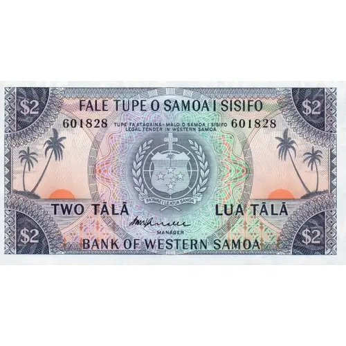 FALE TUPE O SAMOA I SISIFO TUPE FA`ATAGAINA-MALO O SAMOA I SISIFO LEGAL TENDER IN WESTERN SAMOA TWO TĀLĀ LUA TĀLĀ CENTRAL BANK OF WESTERN SAMOA (Translation: Western Samoa Bank, Government allowance of Western Samoa, Two Tālā) |