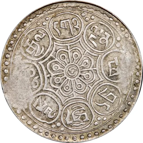 | Obverse description | Eight-spoked wheel surrounded by Tibetan characters within the petals of an eight-petalled lotus. |