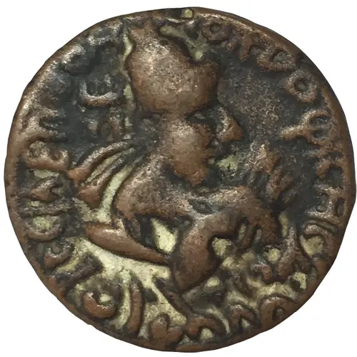 Shiva holding trident in right upper hand in front of Nandi bull to right. Tamgha of Vima Kadphises in left upper field. Kharoshthi inscription surrounding. |