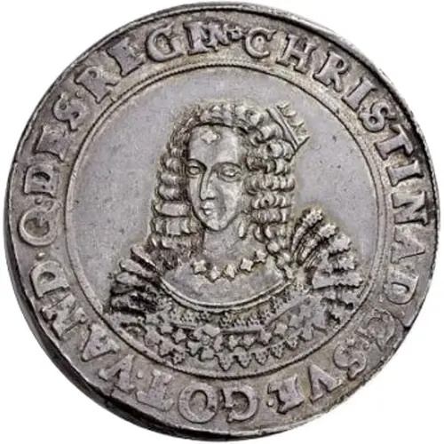 Artistry: The design of this substantial silver piece typically reflects the early Baroque numismatic style prevalent in Northern Europe. While specific engravers for Pomeranian mints of this era are often unrecorded, the artistry generally exhibits a blend of formal portraiture and heraldic precision. The obverse features a youthful bust of Queen Christina, often depicted with a crown or laurel wreath, encircled by her royal titles. The reverse prominently displays the complex armorial bearings, usually incorporating the Swedish Three Crowns alongside the Pomeranian griffin, denoting the new political reality.