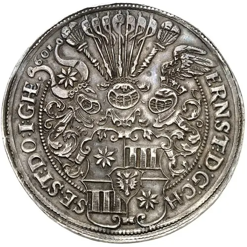 | Aversbeschreibung | 4-fold arms with central shield of Schaumburg, 3 ornate helmets above, date at end of legend. |
