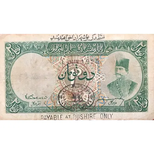 | Obverse lettering | فقط در ( نام شهر) ادا خواهد شد بانک شاهنشاهی ایران تصویر ناصرالدین شاه دو تومان مهر مامور دولت علیه ایران (Translation: PAYABLE ONLY AT (city name) Imperial Bank of Iran Portrait Nasr-ed-Din at right. Two tomans Iranian government seal) |