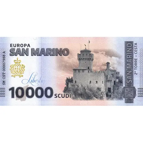 10000 SCUDI QUESTA BANCONOTA NON HA CORSO LEGALE MA È UN OGGETTO DA COLLEZIONE UFFICIALE E UN TRIBUTO ALLA PIÙ ANTICA REPUBBLICA DEL MUNDO, SAN MARINO. Libertas EUROPA (Translation: 10000 SCUDI THIS BANKNOTE IS NOT LEGAL TENDER BUT IS AN OFFICIAL COLLECTOR`S ITEM AND A TRIBUTE TO THE WORLD`S OLDEST REPUBLIC, SAN MARINO. FREEDOM EUROPE) |