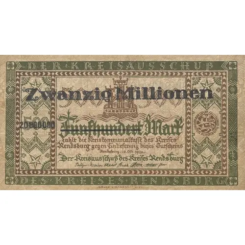 DER * KREISAUSSCHUß 20000000 20000000 Mark Dieser Schein verliert einen Monat nach erfolgter öffentlicher Aufforderungf des Kreisausschusses zur Einlösung seine Gültigfeit DES * KREISES * RENDSBURG (Translation: The District Committee 20000000 20000000 Marks This note will expire one month after the public request for redemption by the District Committee The District of Rendsburg) |