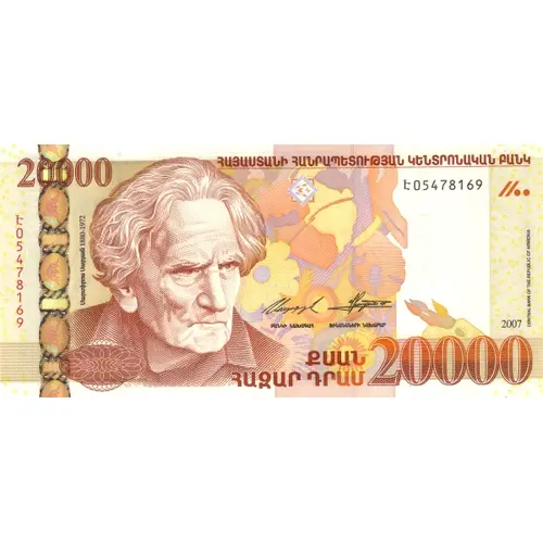 (Translation: CENTRAL BANK OF REPUBLIC OF ARMENIA TWENTY THOUSAND DRAMS)