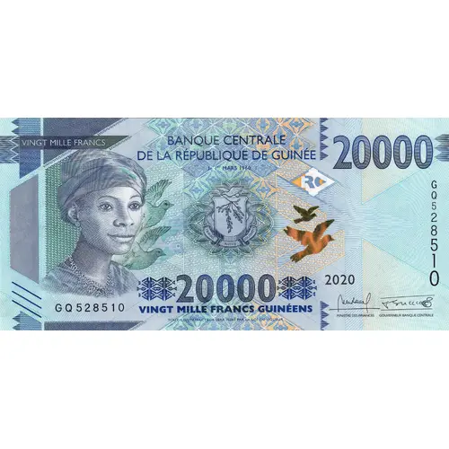 | Obverse lettering | VINGT MILLE FRANCS BANQUE CENTRALE DE LA RÉPUBLIQUE DE GUINÉE le 1er MARS 1960 20000 2020 VINGT MILLE FRANCS GUINÉENS TOUT CONTREFACTEUR SERA PUNI PAR LA LOI EN VIGUEUR (Translation: Twenty Thousand Francs 20000 Central Bank of the Republic of Guinea 1st March 1960 20000 2020 Twenty Thousand Guinean Francs ANY INFRINGER WILL BE PUNISHED BY APPLICABLE LAW) |