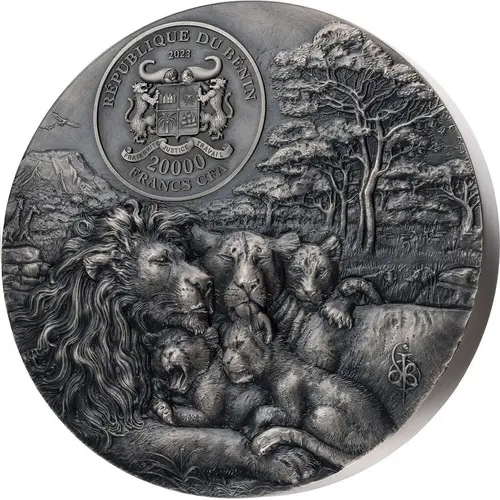 | Reverse lettering | RELIEF MAGNIFIQUE LION CUB 2 KG .999 AG |