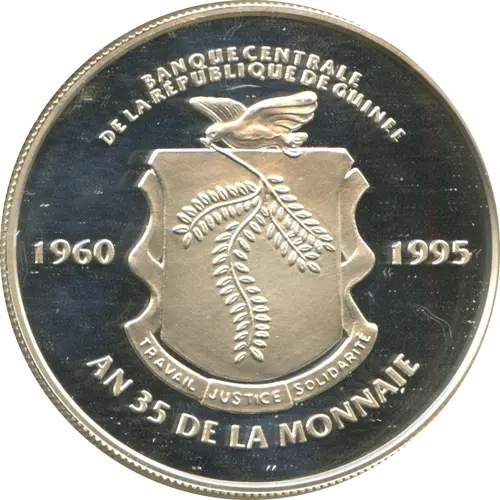 | Obverse lettering | BANQUE CENTRALE DE LA REPUBLIQUE DE GUINEE 1960 1995 AN 35 DE LA MONNAIE (Translation: Central Bank of the Republic of Guinea 35th Anniversary of the currency.) |