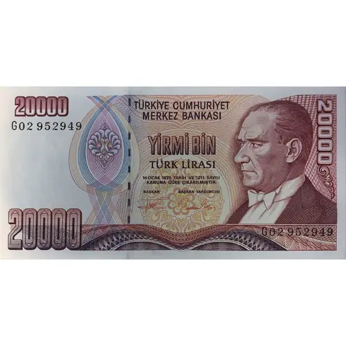 | Opis rubu | TÜRKİYE CÜMHURİYET MERKEZ BANKASI 20000 YİRMİ BİN TÜRK LİRASI (Translation: Central Bank of the Republic of Turkey, Twenty Thousand Turkish Lira) |