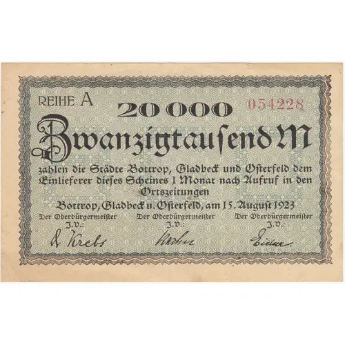 | Obverse lettering | REIHE A 054228 20 000 Zwanzigtausend M zahlen die Städte Bottrop, Glasbeck und Osterfeld dem Einlieferer dieses Scheines 1 Monat nach Ausruf in den Ortszeitungen Bottrop, Glasbeck u. Osterfeld, am 15. August 1923 Der Oberbürgermeister, J.V.: (3 signatures) |