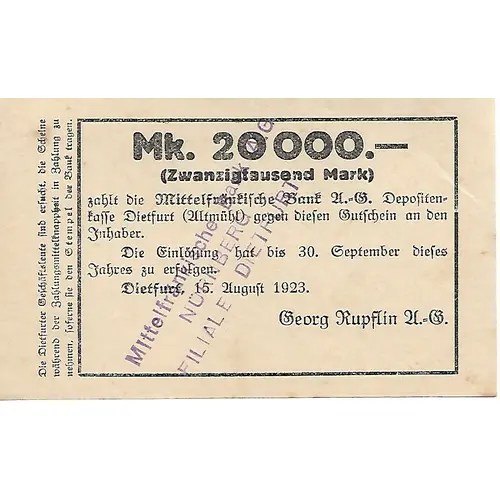 | Obverse lettering | MK. 20000.- (Zwanzigtausend Mark) (Translation: 20,000 Mark) |