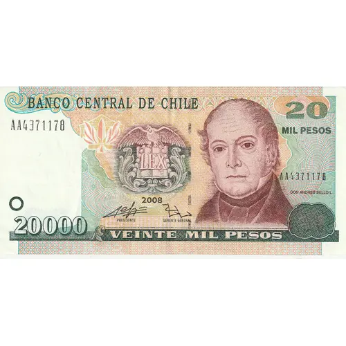 | Obverse lettering | BANCO CENTRAL DE CHILE LEX VEINTE MIL PESOS DON ANDRES BELLO L. (Translation: Central Bank of Chile Twenty Thousand Pesos) |