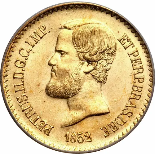 | Descrizione del dritto | Left bust of Pedro II topped the date of 1852 and flanked by Latin subtitles: PETRUS II.D.G.C.IMP. (left); ET PERP.BRAS.DEF. (right). |