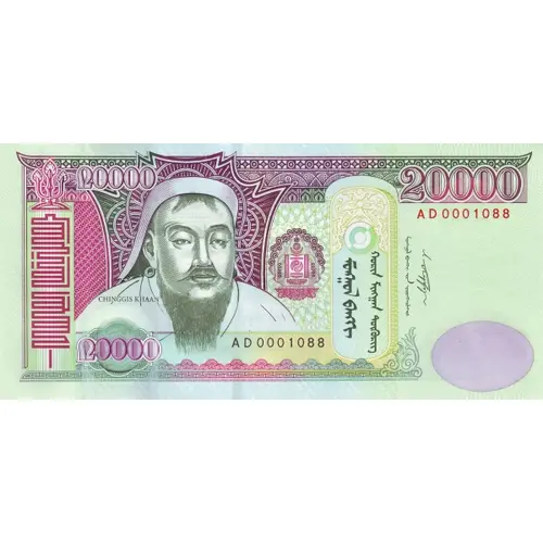 ᠒᠐᠐᠐᠐ МОНГОЛ УЛС МОНГОЛБАНК 20000 ТӨГРӨГ (Translation: Mongolia, Bank of Mongolia, Tögrög) |