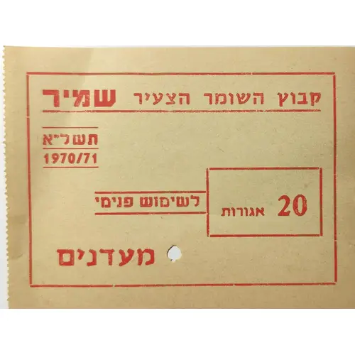 | نوشتههای روی اسکناس | קבוץ השומר הצעיר שמיר תשל`א 1970/71 20 אגורות. לשימוש פנימי מעדנים (Translation: Kibbutz HaShomer HaTzair Shamir, 20 Agorot, for internal use, Ma`adanim) |