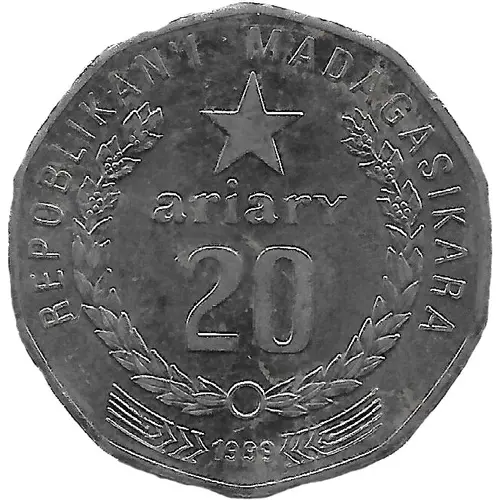 Obverse lettering REPOBLIKAN`I MADAGASIKARA ariary 20 1999