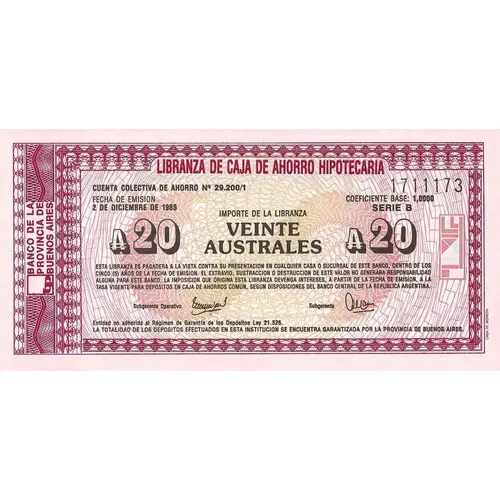 BANCO DE LA PROVINCIA DE BUENOS AIRES LIBRANZA DE CAJA DE AHORROHIPOTECARIA CUENTA COLECTIVA DE AHORRO N° 29.200/1 FECHA DE EMISION 2 DE DICIEMBRE DE 1985 COEFICIENTE BASE: 1,0000 SERIE B IMPORTE DE LA LIBRANZA ₳20 VEINTE AUSTRALES ESTA LIBRANZA ES PAGADERA A LA VISTA CONTRA SU PRESENTACION EN CUALQUIER CASA O SUCURSAL DE ESTE BANCO, DENTRO DE LOS CINCO (5) AÑOS DE LA FECHA DE EMISION. EL EXTRAVIO, SUSTRACCION O DESTRUCCION DE ESTE VALOR NO GENERARA RESPONSABILIDAD ALGUNA PARA ESTE BANCO. LA IMPOSICION QUE ORIGINA ESTA LIBRANZA DEVENGA INTERESES, A PARTIR DE LA FECHA DE EMISIÓN, A LA TASA VIGENTE PARA DEPOSITOS EN LA CAJA DE AHORRO COMUN, SEGÚN DISPOSICIONES DEL BANCO CENTRAL DE LA REPUBLICA ARGENTINA. Entidad no adherida al Régimen de Garantía de los Depósitos Ley 21.526 LA TOTALIDAD DE LOS DEPOSITOS EN ESTA INSTITUCION SE ENCUENTRA GARANTIZADA POR LA PROVINCIA DE BUENOS AIRES. CASA DE MONEDA (Translation: Savings Deposit Certificate Bank of the Province of Buenos Aires Colective savings acount n° 29.200/1 Date of issue 2nd of december 1985 Base coeficient: 1,0000 Series B Value of the certificate Twenty Australes This certificate is payable on sight upon presentation at any house or branch of this bank, within five (5) years from the date of issue. The loss; theft or destruction of this value will not create any liability for this bank. The tax caused by this certificate wil accrue interest, from the date of issue, at the currect rate for deposits in the common savings bank, according to the provisions of the central bank of the Republic of Argentina. Entity not adhered to the Deposit guarantee Law 21,526. All deposits in this institution are guaranteed by the province of Buenos Aires.) |