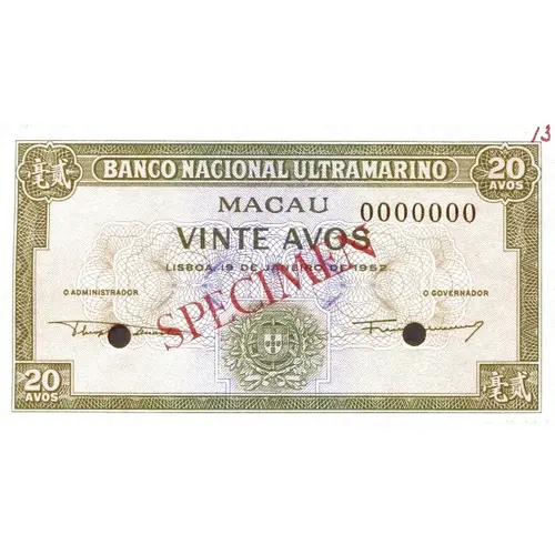 | Obverse lettering | BANCO NACIONAL ULTRAMARINO MACAU VINTE AVOS LISBOA, 19 DE JANEIRO DE 1952. O ADMINISTRADOR | O GOVERNADOR |
