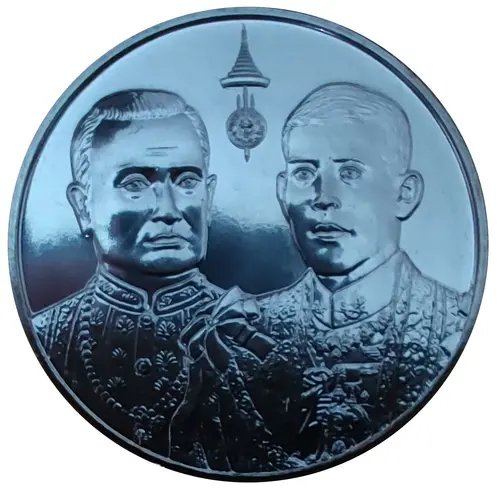 | Obverse description | Conjoined busts of King Buddha Yodfa Chulaloke and King Vajiralongkorn, both front-facing slightly toward the center. Emblem of Royal House of Chakri below nine-tiered umbrella on the top. |