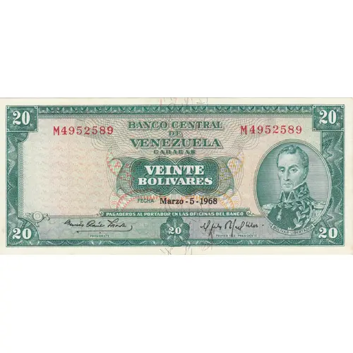 Design in green over a background in yellow with frame-like border. On the left, watermarks zone. On the right, portrait of Simon Bolivar inside an oval from unknown author. On the top, the issuer name `BANCO CENTRAL DE VENEZUELA` «Central Bank of Venezuela». In the center, the denomination in words `VEINTE BOLIVARES` «twenty Bolívares». On the bottom, the payment clause `PAGADEROS AL PORTADOR EN LAS OFICINAS DEL BANCO` «Payments to the Bearier in the Offices of the Bank» and the denomination value `20`. |