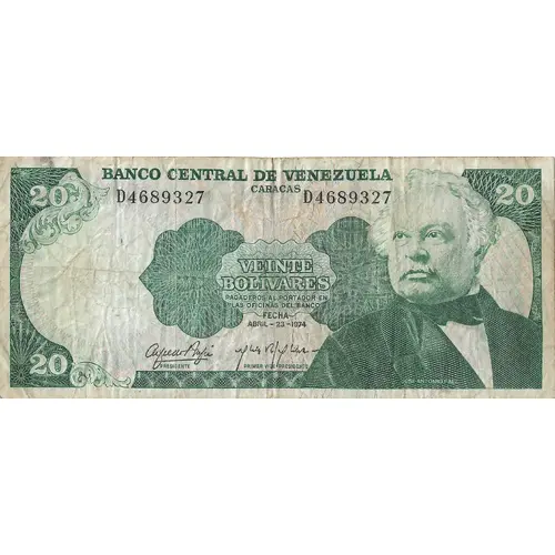 | Vorderseitenlegende | Banco Central De Venezuela Veinte Bolivares (Translation: Central Bank of Venezuela 20 Bolivares) |