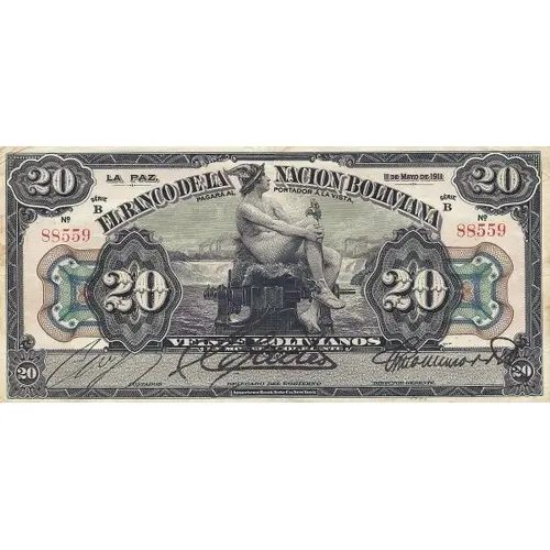 Obverse lettering LA PAZ, 11 de Mayo de 1911 EL BANCO DE LA NACIÓN BOLIVIANA PAGARÁ AL PORTADOR A LA VISTA, 20 20 VEINTE BOLIVIANOS EN MONEDA CORRIENTE