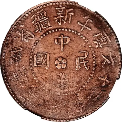 造城省疆新午庚文十二錢紅當 中 國民 華 (Translation: Made in the Provincial Capital (Urumchi), Sinkiang / Year 7 / Each piece worth 20 Cash Republic of China) |
