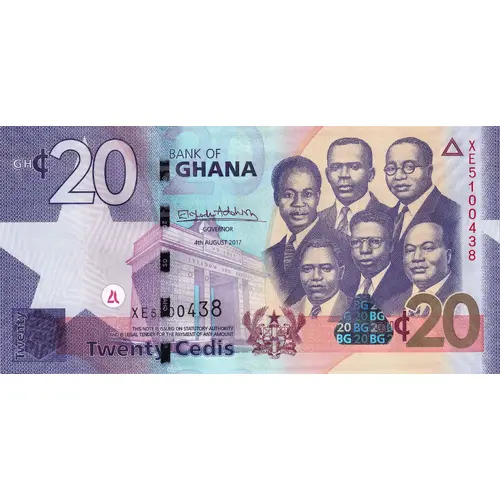 BANK OF GHANA GH¢20 THIS NOTE IS ISSUED ON STATUTORY AUTHORITY AND IS LEGAL TENDER FOR THE PAYMENT OF ANY AMOUNT TWENTY TWENTY CEDIS FREEDOM AND JUSTICE |