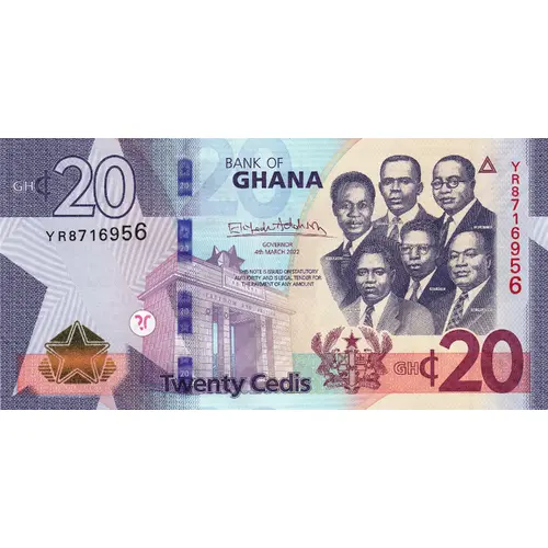 | Obverse lettering | BANK OF GHANA GH¢20 THIS NOTE IS ISSUED ON STATUTORY AUTHORITY AND IS LEGAL TENDER FOR THE PAYMENT OF ANY AMOUNT TWENTY TWENTY CEDIS FREEDOM AND JUSTICE |