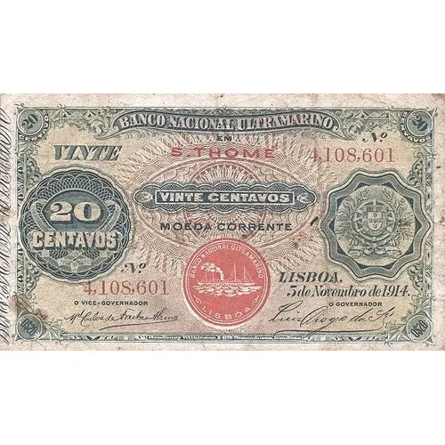 Opis líce BANCO NACIONAL ULTRAMARINO EM S. THOMÉ VINTE CENTAVOS MOEDA CORRENTE LISBOA, 5 de Novembro de 1914. Bradbury, Wilkinson & Cia. Gravadores, Londres